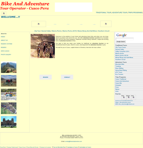 El website Bikeandadventure.com se encuentra inscrito en Adonde.com con el título Bike & Adventure - Agencia de Viajes y Turismo estando indexado en la subcategoría Turismo: Agencias de Viajes de Cusco al lado de 151 páginas de sitios relacionados a la misma temática: